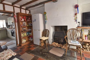 Living room 3.99m x 3.05m (13ft1 x 10ft) - Cottage style window to front, out built fireplace with wood burning stove, open beamed ceiling, exposed timber panelling to one internal wall, TV point, panelled radiator.